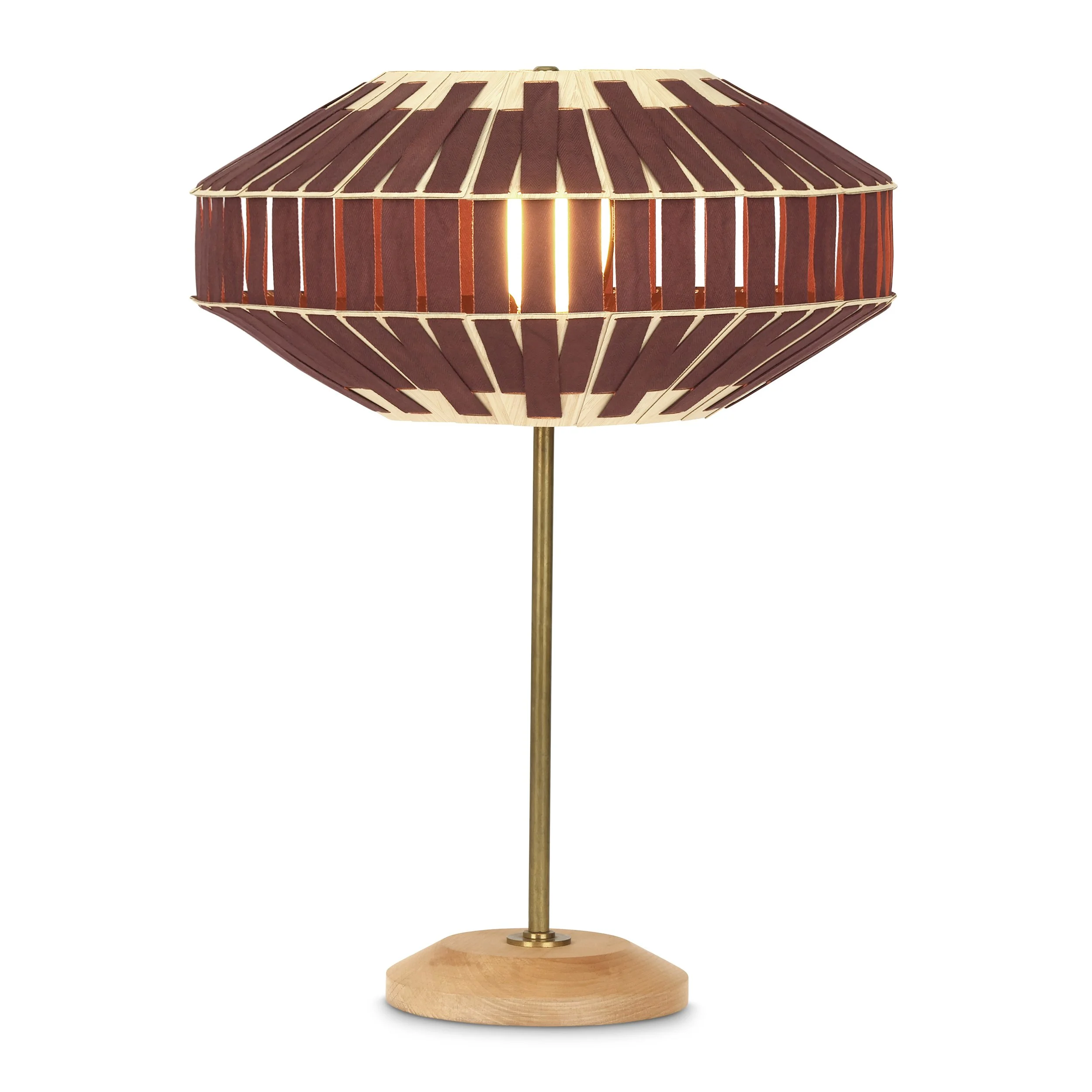 The interior of this table lamp’s bamboo plywood veneer is stained a deep burgundy and the cotton twill stretched between the hemispheres was small batch dyed to match the interior. The base is lathe turned ash that has an organic wax sealer. A six foot length electrical cord extends from the base with a two-prong plug. This is a singular artwork that gives any space a warm and rich glow when illuminated, and a depth of meaning when not.